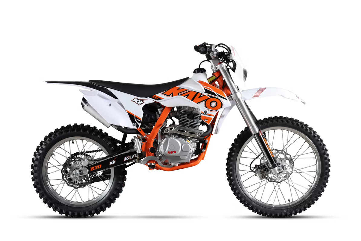 The Kayo K4 is an awesome midlevel dirt bike for all types of riders. The heart of this bike is a very reliable 250 cc air-cooled 4-stroke engine with an electric starter! This smooth engine has a 5-speed transmission to get the optimal power and torque from the engine. We design the frame to be strong yet light and we gave it inverted forks, a stable rear shock and disc brakes front and rear! The K4 has a front headlight/number plate, rear taillight.